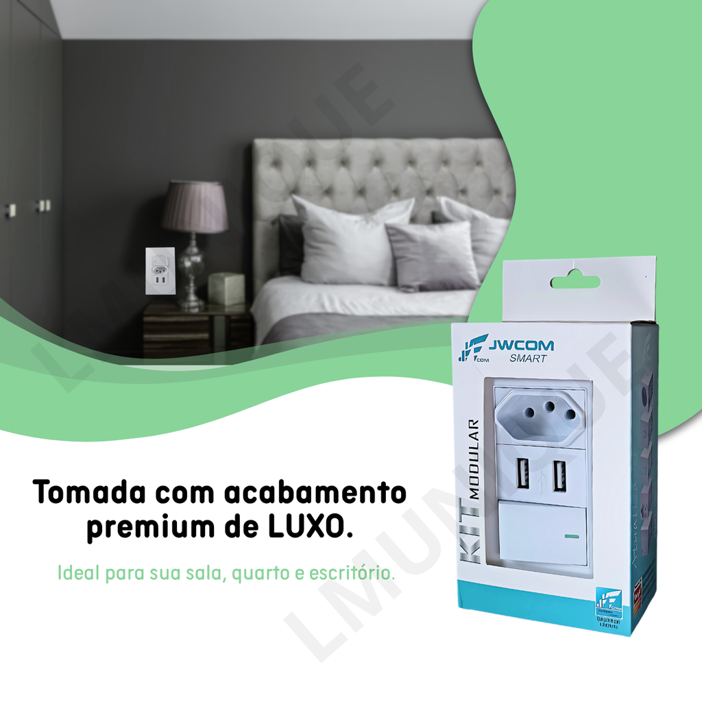Incluso: 1 Tomada NBR 14136 + 1 Interruptor simples + 2 Portas USB 2.0